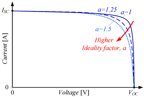 Second, the diode ideality factor (a), also referred to as the emission factor, is included in the numerical formula for determining the diode current, as shown in (2). This factor accounts for the electron–hole recombination and impacts the trend of the I–V property curve.