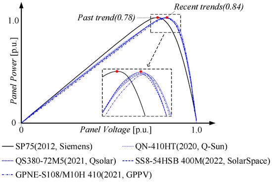 In this article, we studied various PV panels to obtain a standard for the PVE and discovered that the P–V property curve trend has recently changed. To intuitively compare the trends of the studied P–V curves, the curves were reconstructed after conversion using the p.u. law, as shown in Figure 3. The cell diodes of the selected panels were all monocrystalline, so it was assumed that there were no differences according to the panel’s characteristics.
