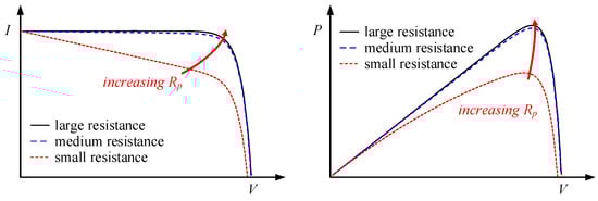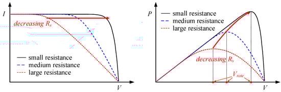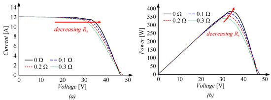 Figure 16 shows the experimental results comparing the I–V and P–V curves, according to the values of Rs,add, which had a great influence on the tendency of the PVE. On the other hand, based on the simulation results, the magnitude of Rp was found to be higher than 10 kΩ. In addition, the sufficient value of Rp (>10 kΩ) did not have much impact on the I–V curve. Therefore, the impact of Rs is mainly studied in this section.