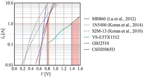 Figure 8 compares the forward bias and current of the selected diodes. The black lines represent the diodes used in previous studies. The main signal level diodes used were MR860 (fast recovery power rectifiers []), 1N5400 (general purpose silicon rectifiers []), and S2M-13 (surface mount glass passivated rectifier []). These diodes have a relatively low slope, which implies that a certain amount of increment in the current could lead to a relatively higher power loss. Due to the small available current in these diodes, a high-power PVE cannot be fabricated. Moreover, the thermal design is limited by the absence of thermal pads to attach the heat sink directly on the devices, such as in the 1N5400 and S2M-13.