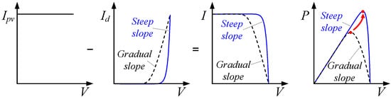 First, the VS-E5TX1512 (hyper-fast rectifier) could withstand up to 1200 V with a 15 A rated current; therefore, it could sufficiently handle the ISC (about 11 A) of a general 400 W panel. However, the slope of its I-V curve is significantly low, and the loss increases as the current increases. Therefore, this diode is not appropriate for the proposed PVE application. Figure 9 shows that the slope of the Id–V curve is relevant to the recent trend of PV cells. It can be noted that the I–V and P–V curves fundamentally originate from the Id–V curve. Therefore, in case of a higher slope in the Id–V curve, the recent technological state can be more accurately reflected in the PVE.