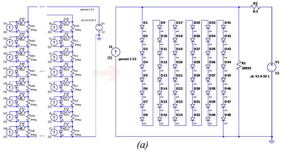 Figure 10a shows the equivalent conversion of the PV cell diode model to the power diode model in LTspice. The value of the constant current source is not changed, Rs can be calculated by multiplying by the number of diodes, and Rp can be calculated by dividing by the number of diodes. Figure 10b,c show the simulation results of the I–V property curves according to Rs and Rp, respectively. These results were matched with Figure 6 and Figure 7. It can be seen that the maximum Vrate of the corresponding diode was maintained when Rp was 10 kΩ or above.