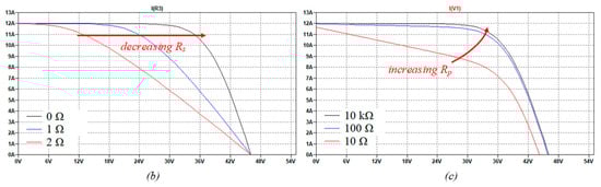 (a) Equivalent conversion of the PVE model in LTspice; (b) Simulation results of I–V properties with decreasing Rs; (c) Simulation results of I–V properties with increasing Rp.