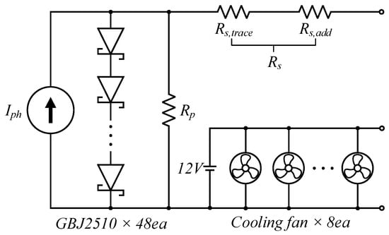 In this paper, a 400 W PVE was built, and its actual configuration is shown in Figure 11. It consisted of a DC power supply operating in constant current mode, 48 series-connected power diodes (GBJ2510), series resistors (Rs), parallel resistors (Rp), and eight cooling fans operating through external power sources, to control the heat of the diodes. Each cooling fan was designed to handle six diodes, considering not only the window of air flow but also the maximized effect of wind speed. As a result, the overall power density could be optimized using the selected diode and heat sink.