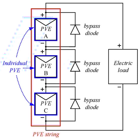 In order to investigate the partial shading effect, three PVEs were connected in series to form one string, and both ends of the string were connected to the electronic load, as in Figure 12. An additional bypass diode was connected to each PVE output, to prevent a current bottleneck. Partial shading was simulated by varying the magnitude of the current source of each PVE.