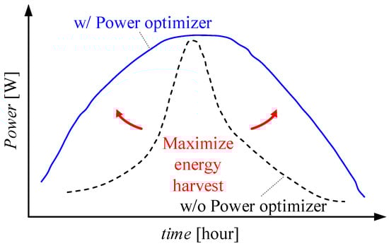 When a solar panel (black solid-line) is operating alone, the output power is high at noon when the level of sunlight is high as well. When the power optimizer is connected (blue dot-line), the MPPT operation increases the solar power output. Detailed results are shown in the experiment section.