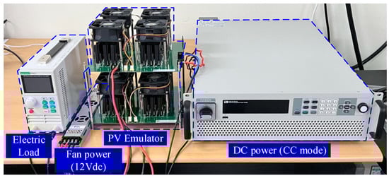 Constructing an experimental environment using actual PV panels is difficult, because solar power generation is highly dependent on the external environment. ‘Photovoltaic emulators (PVE)’ can be studied for the purpose of emulating the operational characteristics of an actual PV system under various external conditions [,]. Under the desired conditions, the PVE can conduct tests using repetitive and consistent methods. In addition, a PVE can implement an I–V curve applying changes of daylight and load. In addition, it can be easily integrated with a power converter/inverter, validating the proper operation of maximum power point tracking (MPPT).