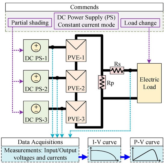 Figure 15 shows a block diagram of the experimental process of the proposed PVE, showing the partial shading and load changing conditions. As the main power components, there were three DC power supplies (PS) that were operated in constant current (CC) mode, three PVEs, and an electric load. This block diagram shows the multiple series connections for testing partial shading; moreover, it could be configured as a single DC PS and PVE for simple testing. In the commends block, the partial shading signals were sent to the DC-PS to change the CC commends. Meanwhile, the load change signals were sent to the electric load, to test the transient response. Using the measurement block, the values of the voltage and current at the input and output were acquired. Based on these data, the I–V curve was first obtained, and then it could easily be converted into the P–V curve.