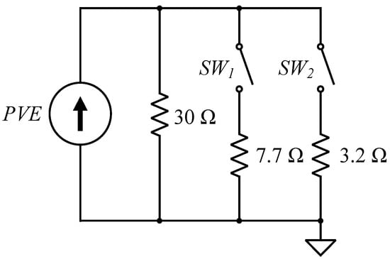 Figure 5 demonstrates that the PVE cell diode can be replaced with an actual diode, to constitute a circuit. Instead of the diode signal levels used in previous studies [,,], the proposed PVE uses a power diode to increase the power capacity.