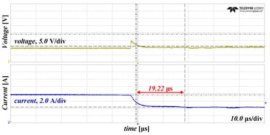 The rapid response of an PVE is important when the partial shading effect needs to be emulated. This can be tested through step changes in the current source, representing rapid changes of irradiance. Instead of using the electronic load of Section IV-B, pure resistive loads were used to verify the dynamic response, avoiding interference by the other circuity within the electronics load. To investigate the response time when changing the input current of the PVE, the load was fixed at 6.2 Ω, and the input current was reduced from 12 A to 6 A.