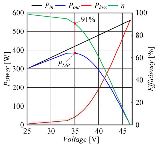 The input power (Pin) increased linearly as the voltage increased, and the output power (Pout) reached the maximum value at 35 V (VMP) and then decreased gradually along with the P–V curve and the power loss (Ploss) increased accordingly. The efficiency of the PVE gradually increased as the voltage was decreased. In the range where the voltage was less than 35 V, the current flowing to the PVE became very small and this is not a general operational point of the experiments. Therefore, the system efficiency was 91% at 35 V, near the MPP. When the proposed PVE was integrated with the MPPT converter, to verify the performance of its maximum output power capability, the main operating point of the PVE was near the MPP. Therefore, the efficiency in this area was, not only very important, but also acceptable.