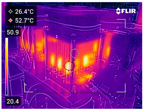 Figure 23 shows the effectiveness of the PVE prototype regarding heat dissipation in continuous operation for 1 h. In this test, the temperature of the laboratory was maintained at around 25 °C to 27 °C, and the maximum heat point obtained was 52.7 °C. Based on the thermal design, the error was maintained 5.0 °C below the calculated value, at 48.3 °C.