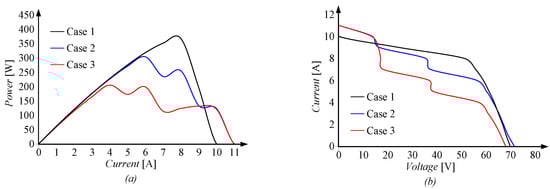 Case 1 represents the state of the same irradiances, without partial shading, and identical currents of 9 A were allocated to the three PVEs. Looking at the P-I curve (black line) in Figure 24a, only one global value of MPP appears, as if single PVE was operated. Figure 24b also shows the shape of the I–V curve (black line), without sudden current fluctuations, as in the operation of a single PVE.