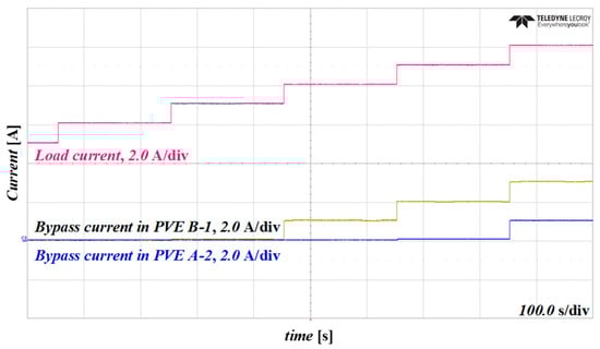 The currents flowing into the output (load) and bypass diode were investigated, to verify the proper operation of the multiple series connections and to describe the operational principle. Thus, the experimental waveforms were obtained as seen in Figure 25 over a substantial period of time, and this test was associated with Case 2, as seen above when obtaining the curves for Figure 24. In this experiment, an output current of 5 A flowed through the electronic load as an initial condition. During the test, the load current was increased by 1 A as a step change every 200 s. Until the current reached at 7 A, all PVEs operated in the normal mode, without bypass operation. When it reached 8 A, the bypass diode of the B-1 model started to operate, and a current of 1 A that exceeding the input current of 7 A flowed through the bypass diode. When it became 9 A, the bypass current of the B-1 model increased to 2 A. When it reached 10 A, the bypass diode of the A-2 model also started to operate, and the 1 A exceeding the input current of 9 A in the A-2 model was bypassed. Through this experiment, it was confirmed that partial shading operation can be simply implemented using multiple series connection of several PVEs, without additional controls and devices.