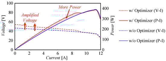 Due to the nonlinearity of the PV system caused by changing the irradiation and temperature, the MPPT algorithm was employed to attain the maximum power production. This algorithm measured the voltage and current of the PV array and tracked these variations in the MPP to obtain the maximum efficiency from the PV, such as in the perturb and observe (P&O) method in [,]. To verify the integrated MPPT operation, the proposed PVE and the power optimizer of SolarEdge’s P400 (P&O method, []) were utilized. Referring to Figure 26, the x-axis represents current, and the main and auxiliary y-axes represent the voltage and power, respectively. The red area of the P–I curve indicates that increased power (red line) was achieved using the power optimizer when the current was below than 9.3 A. The power optimizer (buck-boost converter) could amplify the voltage, to produce a constant power in the low current region. It can be noted that the integrated operation between this optimizer and the proposed PVE was demonstrated and the performance of the power optimizer was validated.