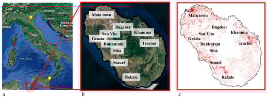 Localization of Pantelleria Island in the Italian territory (a); satellite maps of Pantelleria Island with the indication of villages (b); GIS map of Pantelleria Island with the indication of villages and residential building stock (c).
