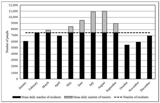 The island has a surface of 84.5 km2, mostly covered by hills, it includes the main town with the harbor and service buildings (educational, health, commercial, and tourism) on the northwest coast, together with many remote minor villages sparse on the territory (Figure 1). It has a warm temperate climate and 717 Heating Degree Days (HDDs), so it belongs to the Italian climate zone B according to the national classification [42]. It is featured by high average annual solar radiation (2100 kWh/m2) and wind speed (7 m/s at 25 m over the sea level), which make the island interesting for renewable sources exploitation. In 2011 the entire island accounted for 7846 residents and a population density of around 90 people per square kilometer [43] but, notably, in summer it can reach up to 11,000 people due to tourists [44] as shown in Figure 2. For decades, the island’s economy has been mostly based on tourism-related activities, due to which a strong increase in the population and related energy consumption occurs from May to September. Regarding its building stock, in 2011 it accounted for 6280 buildings, 5281 of which were residential [43] (these data can also be substantially assumed currently because new buildings on Pantelleria are very rarely built due to restrictions).