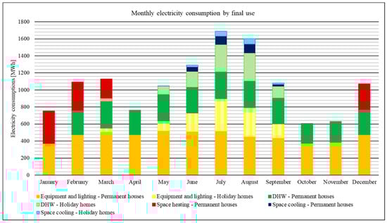 To strengthen the issue related to seasonal variability of energy consumption, based on the mean daily number of people per month [44] and the known number of residents [43], a percentage of occupied residential built volume, divided by permanent houses and holidays homes, was calculated per each month and used to recalculate the hourly based electricity profiles with a different amplitude on monthly base (Figure 3). As a result, it was observed that the highest monthly electricity consumption, which occurs in July (1689 MWh), is almost 3 times than the lowest one (608 MWh), which occurs in October. Despite this, the permanent houses, on a yearly basis, comprise 80% of the island power load, whereas the holiday homes total 20%. In detail, the permanent houses require 43% of the overall electricity consumption for the equipment and artificial lighting, 25% for the DHW, 10% for space heating, and 2% for space cooling; the holiday homes require 10% for the equipment and lighting, 9% for the DHW, and 1% for space cooling. Moreover, it must be noted that the electricity demand for equipment and artificial lighting and for DHW represent the highest contributions to the residential building stock electricity consumption, as they account for 53% and 34%, respectively. The demand for thermal space is less impacted, as the space heating contribution accounts for 10% and the space cooling only for 3%.