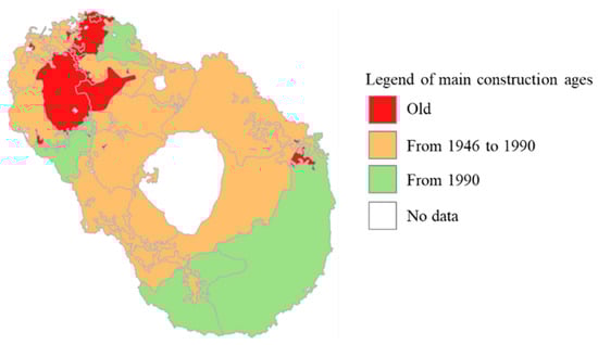 In Figure 4, the Census Units of Pantelleria were mapped by the main period of construction. As an example of findings, it can be observed that the oldest building stock, featured by greater thermal inertia, is prevailing in the proximity of the main town, whereas the rest of the island is dominated by 60s/80s buildings with uninsulated envelope, except for some rural/touristic areas in the northern and southern parts with the higher number of new buildings.