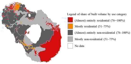 The GCPH was also used, i.e., the number of residential buildings per each number of floors (1, 2, 3, at least 4 floors) data, to determine the built volume in absence of building height data in the building cadaster vector layer. In detail, the sum of buildings’ footprint surfaces per each Census Unit was split into four groups in proportion to the number of buildings having 1, 2, 3, or at least 4 floors, according to the GCPH. Then, a typical height was assumed and associated with each share of floor areas (data from the building cadaster vector layer), considering 3 m per floor.