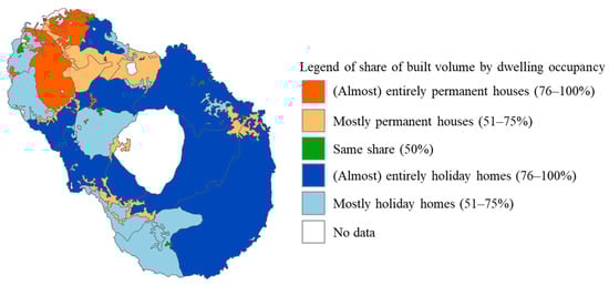 As discussed in the literature review, Mediterranean small islands are strongly affected by seasonal variations of energy consumption with higher summer peaks due to tourists’ influx. To consider this aspect, the determined residential building stock volume was split into two shares referred to as permanent houses and holiday homes. To this end, based on data from the GCPH, for each Census Unit the sum of residential units with residents was considered as a permanent house, whereas those with non-residents as holiday homes. The assessment returned 3312 permanent houses and 1627 holiday homes.
