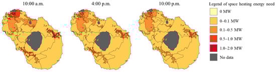In Figure 7, the maps show the space heating needs in a typical (average) winter workday. From a spatial perspective, the space heating need prevails in the main town and other more urbanized villages in the south area (Khamma, Tracino, Scauri); from a temporal perspective, it is higher in the morning due to lower temperatures.