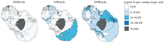 In Figure 8, the maps show the space cooling needs in a typical (average) summer workday. Spatially, the space cooling need dominates in the south area of the island, which is characterized by a higher presence of tourists; temporally, it increases during the day until the evening peak, consistently with higher temperatures.
