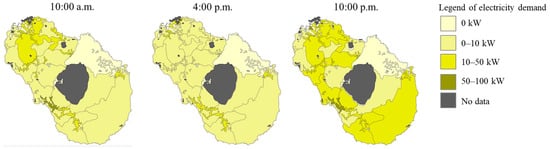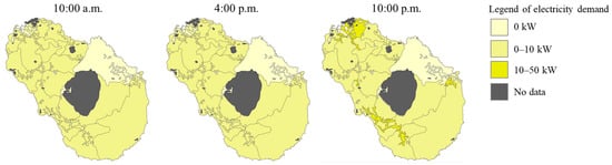 The electricity demand for appliances and artificial lighting is reported for a typical winter day in Figure 9 and for a summer day in Figure 10. The maps show that the demand is clearly widespread throughout the entire island, whereas it prevails in greater villages and, in summer, in the southern areas dominated by the tourists’ presence. Moreover, in all seasons an evening peak is observed due to the return of people at home from work or beaches.