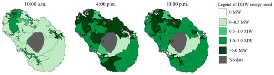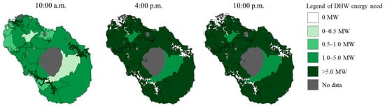 The energy need for DHW is reported for a typical winter day in Figure 11 and for a typical summer day in Figure 12. Although with different intensities, the spatial and temporal trends are similar to those of the electricity demand for appliances and artificial lighting.