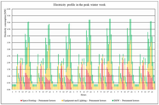 In Figure 13, the profile associated with the winter week with the highest electricity consumption, entirely due to permanent houses, is reported. It can be observed that the daily greatest consumption peak occurs in the evening, whereas the two remaining lower peaks occur in the early morning and lunchtime. All of them are probably linked to the return of resident people from work/school activities and, indeed, are mainly affected by equipment, lighting, and DHW use. Moreover, the daily pattern is similarly repeated during the entire week, likely due to homogeneous climatic conditions and occupancy profiles. The weekly power load (327 MWh) is affected by 23% by space heating, 36% by equipment and lighting, and by 41% by DHW.