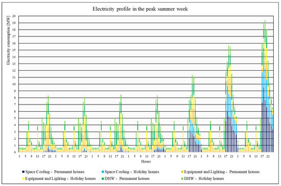 In Figure 14, the profile associated with the summer week with the highest electricity consumption, due to both permanent houses and holiday homes, is reported. The daily greatest consumption peak occurs in the evening, possibly related to the return from work and beaches. Interestingly, due to a strong variation of climate conditions in summer, daily profiles with quite a different magnitude during the week can be observed. The weekly power load (607 MWh) is affected by 28% by space cooling, 34% by equipment and lighting, and by 38% by DHW. The relevant contribution of the holiday homes, which are responsible by even 41% of the whole weekly load, implies that the summer peak (19.4 MW) power is around three times higher than in the winter (5.3 MW).