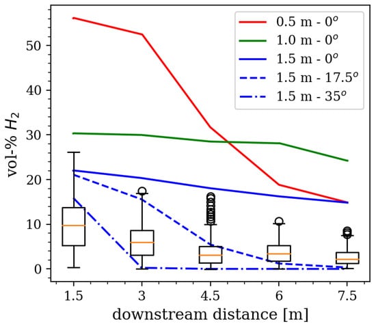 In order to validate our methodology and modeling parameters, simulations of the HSE-Test 6 [9,10] were performed. This was a vertically downward release 100 mm above the ground. The most applicable measurements to our work from this test are the hydrogen concentration measured at 5 distances downstream at a height of 0.25 m. The volume fractions in Figure 23 from [9] show instantaneous hydrogen concentrations at downstream distances of 1.5 m, 3.0 m, 4.5 m, 6.0 m, and 7.5 m. The data from this figure was extracted, and box-and-whisker plots of the concentration data are shown in Figure 3. They show that the highest volume fractions were measured at =1.5 m distance downstream, which has a maximum value around 26% and more typical volume fractions between 5 and 15%. At 3.0 m downstream, the maximum observed concentration was lower, at approximately 17%, with the majority of the data between about 4 and 8%. The measurements at 4.5, 6.0 and 7.5 m downstream have fairly similar median concentrations around 2–3%, with decreasing peak concentrations.