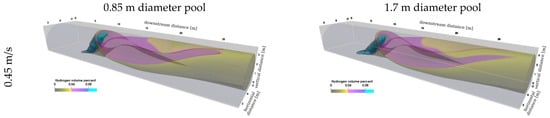Hydrogen from the pool warms and mixes with air, becoming more dilute as the mixture travels downwind. The locations of the 4% and 8% mole fraction contours are shown in a three-dimensional view for several cases in Figure 4. For turbulent plumes, sustained light-up to a flame will occur at a mean mole fraction much higher than the 4% lower flammability limit; it will occur, typically, above 8% [36], so this contour is more representative of an area to avoid ignition sources than the mean 4% mole fraction contour. In all cases, near the pool, the density of the hydrogen is near that of air and the plume remains close to the floor. Downwind of the pool, there is some buoyancy to the mixture, and the 4% and 8% mole fraction isovolumes extend off the floor. As expected, this angle is steeper for the 0.45 m/s crosswind than the 1.34 m/s crosswind. The hydrogen is pushed towards the facility exit by the crosswind and exits through the outlet after interacting with the ceiling, in the 0.45 m/s case, or before interacting with the ceiling, in the 1.34 m/s case. Because the larger 1.7 m diameter pool has less upward momentum (because the volumetric flow rate of hydrogen is the same for both pool diameters), the wind pushes the flammable contours further downstream, and the contours remain closer to the ground than for the smaller pool diameter. The plume dispersion and the location of these 4 and 8% contours are the primary quantities of interest (QoIs) in this work, as these will inform the placement of the sensors during the experiments.