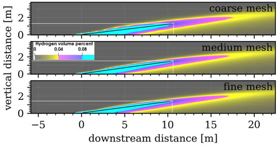 We found that the choice of solvers did influence the shape of the hydrogen plume. The results presented here use the TPETRA equation solver using the PRESET scheme. The convergence tolerance was set to 1 × 10−8 for both continuity and scaler functions. The convection terms in the equations are discretized with a first-order upwind differencing scheme [34], using a hyperbolic tangent bending method with a shift of 1000 and width of 200 for the momentum equations, and a shift and width of 2 for continuity. Equations were solved using second-order-in-time.