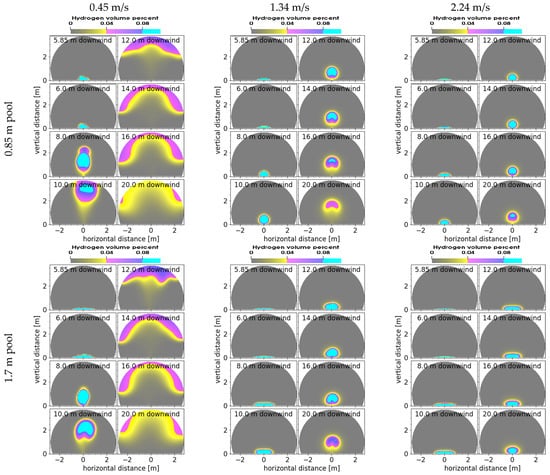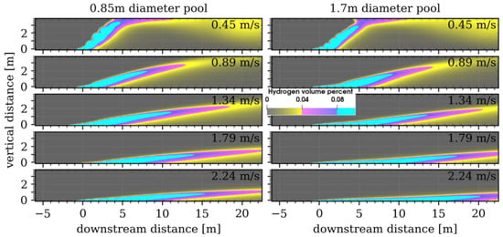 To help understand the shape and location of the plume, cross-sections for several conditions are shown in Figure 7. In all cases, the center of the pool in the first frame (5.85 m downwind) shows flammable mass extending only a few cm above the ground level. Only beyond the edge of the pool (8 m downwind) does the flammable mass (4% mole fraction contour) start to extend above ground level, and for the 2.24 m/s crosswind, not until 10 m downwind. In the later frames (>8 m downwind for the 0.45 m/s case, >10 m downwind for the 1.34 m/s cases, and > 14 m for the 0.85 m diameter pool in the 2.24 m/s case), there is no longer any flammable mass touching the floor, and the plume demonstrates a non-circular shape with some tucking in of the flammable mass on the bottom of the plume, as the vortices in the wake of the plume affect its shape. For the 0.45 m/s case, the plume can be seen reaching the ceiling 10–12 m downwind and then being pushed downwind along the curved ceiling of the Shock Tube Facility, and some hydrogen that is potentially flammable (>4%) is observed all the way to 20 m downwind. For the 3 and 2.24 m/s crosswinds, the hydrogen never reaches the ceiling. In all cases, the larger, 1.7 m diameter pool with the lower upward momentum of hydrogen, shows hydrogen remaining closer to the floor than the smaller pool for each downwind location. For the 2.24 m/s crosswind and the 1.7 m diameter pool, the flammable hydrogen mass remains in contact with the floor all the way to 20 m downwind, and almost to the facility exit.
