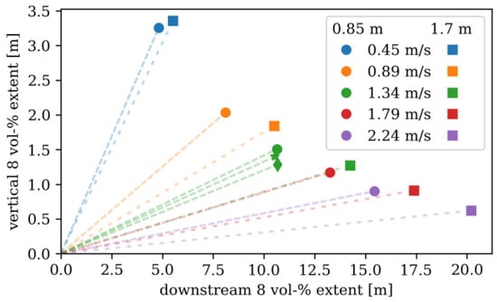 Maximum extent of the 8% mole fraction, vertically and downstream, for the two different pool sizes. The star and diamond symbols are also simulations for the 0.85 m diameter pool, using a coarse and fine mesh, respectively.
