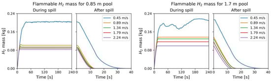 Evolution of flammable mass within for the two different pool diameters as a function of wind speed. For the second frame in each case, time 0 represents when the hydrogen inflow was set to 0.