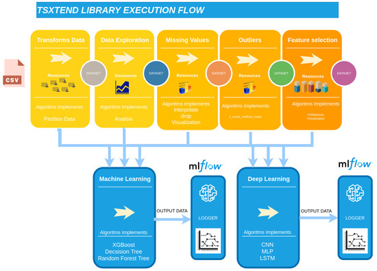 This paper proposes a tool called TSxtend for time series analysis. TSxtend presents a modular architecture and standardises the different stages of experimentation, creating a workflow through a simple configuration file. The proposed tool allows for the end-users to work on time series data without programming knowledge using the available techniques and focusing on developing the research. The tool enables data filtering and cleaning to remove incorrect or nonessential information. Finally, TSxtend has the ability to execute deep prediction and machine learning algorithms that are commonly utilized in various domains, such as energy [], medicine [], or geoscience [,]. This allows for a wide range of applications and flexibility in its usage. The results are presented through the visualization module, enabling end users to analyze the results at different workflow stages. A summary of the main contributions of this paper is as fllows: