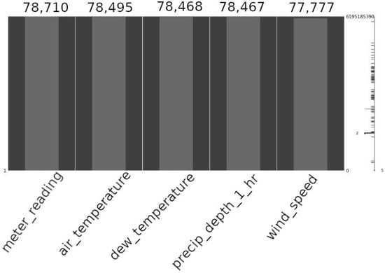 Dealing with incomplete data is a common challenge when working with datasets, especially regarding energy efficiency [,]. Incomplete data can arise for various reasons, including faulty sensors, lost data during transmission, or missing data due to human error. This type of data can cause malfunctions in machine learning prediction algorithms, so it is essential to apply pre-processing techniques to deal with these errors and achieve better results. To address this issue, a submodule was created within the data processing module and the focus was placed on removing missing values from the dataset.