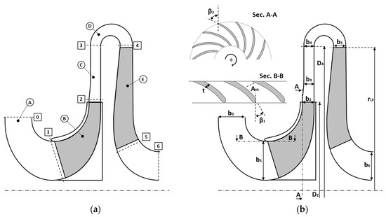 On the other hand, the geometric quantities of the inlet duct, the crossover bend, and the return vane channel were considered in the approach as dependent parameters (Table 2). These quantities were adjusted to obtain mutually consistent perturbed geometries of the stage. Namely, the parameters in Table 2 were modified to maintain a geometric similitude of the inlet duct and the components downstream of the diffuser (Figure 1a, components A, D, and E).