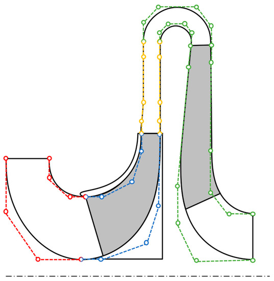 In particular, the impeller end-walls were described based on [34], adding supplementary poles (Figure 2, blue dots 2 and 4) to ensure smooth continuity with the other parts [35]. The shape of the inlet duct was frozen (Figure 2, red dots) to preserve the components upstream of the impeller. Instead, the radial position of the poles at the crossover bend inlet (Figure 2, green dots 1), the leading edge (LE) position of return channel blades, and the radial position of poles near the trailing edge (TE) of return channel blades (Figure 2, green dots 8 and 9) were adjusted following Equation (2).