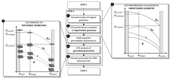 Using the values of the unperturbed compressor stage (baseline) obtained for stall (), design (), and choke () conditions during task 2 of step 2, the parametric analysis was performed by running CFDs, with imposed pressure ratio on each perturbed stage, for a total of 1800 simulations per stage (task 4 of step 2, Figure 3). The reason behind imposing pressure ratios was to determine what flow rate the modified centrifugal compressor would achieve to guarantee the same pressure rises. However, an interesting alternative that will be evaluated in future works would be to impose a fixed mass flow rate for the design point and a fixed pressure ratio for the stall and choke conditions. At the end of step 2, by leveraging the analyzed geometries and their performance, a dataset was generated (task 5 of step 2, Figure 3) for feeding and training an ANN in step 3. As a matter of fact, knowing the behavior of the unperturbed geometry, it is possible to associate a geometric variation with a corresponding variation in aerodynamic performance. A summary of the process followed in step 2 is shown in Figure 3.