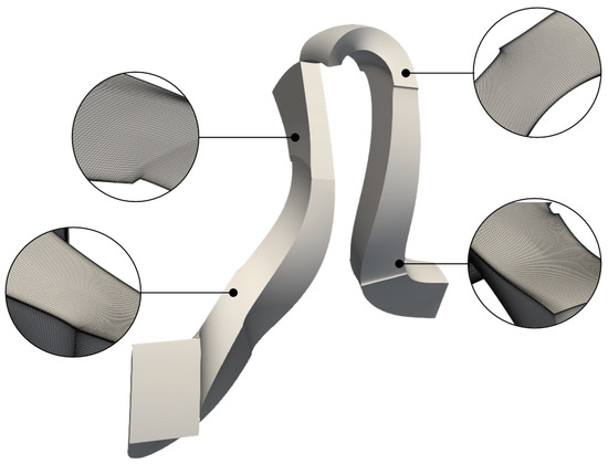 Focusing on CFD simulations, RANS computations were carried out by means of TRAF code [38]—a 3D viscous solver for the resolution of Reynolds-Averaged Navier–Stokes equations on structured grids [39]. In the project, convective fluxes were discretized with a 2nd order TVD-MUSCL strategy based on the Roe’s upwind scheme, while a central difference scheme was adopted for viscous fluxes. The turbulent closure was achieved with Wilcox’s k-ω model [40], guaranteeing a high level of parallelization with a hybrid OpenMP/MPI architecture [41]. H-type grids were adopted to discretize the computational domain shown in Figure 4. Specifically, an H-type grid was used for the first block composed by the inlet duct, the impeller, and the vaneless diffuser, and another H-type grid was adopted for the second block consisting of the crossover band and the return vane channel.