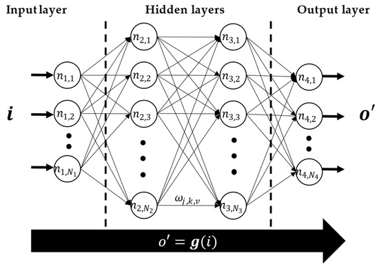 This task involves the recursive execution of the training phase and the frequent adjustment of the weights used to handle the passage of information through neurons. Finally, having trained the ANN, a k-fold cross-validation process is necessary to understand the reliability of the ANN and to avoid the occurrence of under-fitting and over-fitting problems. In Figure 5, a schematic representation of the trained feed-forward ANN with two hidden layers is shown.
