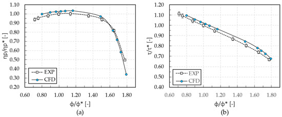 Focusing, for the sake of brevity, on the stage designed for low mass flows (measurements achieved for the other stages have been omitted), the CFD predictions appear to slightly overestimate the performance of the stage. However, these results can be considered acceptable since they are within (or close to) the error limits of the experimental measurements. In Figure 6, the prediction of the low mass flow stage, in terms of polytropic efficiency (Figure 6a) and work coefficient (Figure 6b), are presented.