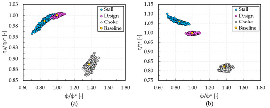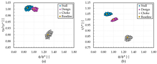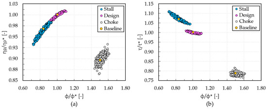 In Figure 9, as aforementioned, a lower dispersion of performance is observed. Indeed, the polytropic efficiency (ηp/ηp*) varies from 0.99 to 1.01 at stall (from −1.0% to +1.0% in terms of relative percentage variation respect to baseline), from 0.99 to 1.01 at design (from −1.0% to +1.0%), and from 0.88 to 0.92 at choke condition (from −2.2% to +2.2%). Moreover, the work coefficient (τ/τ*) varies from 1.04 to 1.06 at stall (from −1.0% to +1.0%), from 0.99 to 1.01 at design (from −1.0% to +1.0%), and from a value of 0.81 to 0.86 at choke (from −3.6% to +2.4%). Finally, the flow coefficient (ϕ/ϕ*) varies from 0.82 to 0.97 at stall (from −5.7% to +11.5%), from 0.96 to 1.08 at design (from −4.0% to +8.0%), and from 1.23 to 1.37 at choke condition (from −3.9% to +7.0%).