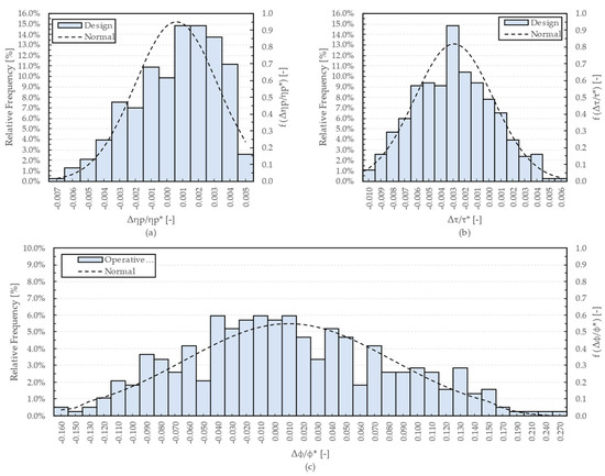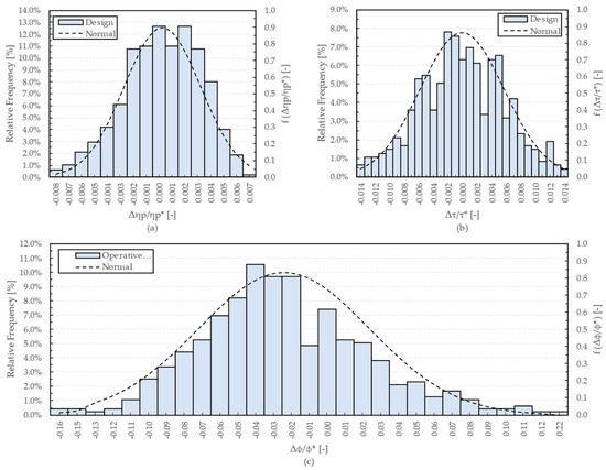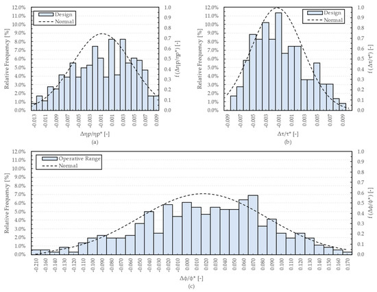 The relative frequency distributions are also comparable with the Gaussian distributions (dashed lines of Figure 10, Figure 11 and Figure 12) obtained in terms of probability density function by determining the mean and standard deviation of , , and . The distributions shown in Figure 10, Figure 11 and Figure 12 exhibit trends in agreement, with the results provided in the recent scientific literature. In fact, polytropic efficiency and work coefficient trends follow a Gaussian distribution, as previously observed by Panizza et al. [19] and Javed et al. [20]. Recently the outcomes from Li et al. [23] and Tang et al. [25] still confirm these results. Moreover, the relative frequencies reported in Figure 10, Figure 11 and Figure 12 are in line with those obtained by Zhu et al. [22]. However, unlike the above works, in the present research, special attention was also paid to the impact on the operating range of the centrifugal compressor stage. This novel aspect is interesting, especially for applications, such as expander-compressors, where a wide operating range is required. In this prospective, focusing of Figure 10, Figure 11 and Figure 12, the perturbed stages exhibit the same operating range of the baseline with a relative frequency of 6.0%, 5.8%, and 7.5% for low, medium, and high flow stages, respectively.