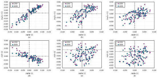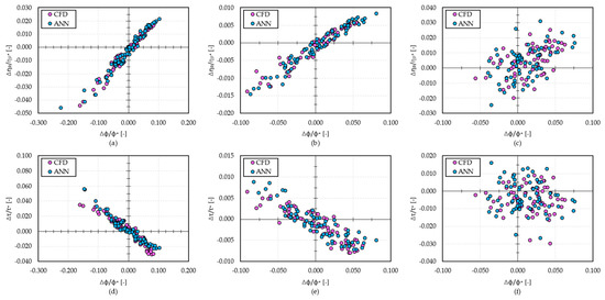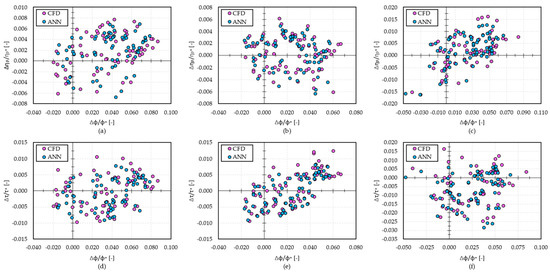 Moreover, the results of the ANN training are provided in Figure 13, Figure 14 and Figure 15. In particular, the ANN forecasts (cyan dots) and the CFD evaluations (magenta dots) of each tested geometry are compared in terms of and at section 6. Similar results were obtained for and , but they are not provided for the sake of brevity. Concerning Figure 13d, the ANN forecasts exhibit a lower predictability when Δϕ/ϕ* are lower than −0.10. The same trend is achieved in Figure 14d. However, in this case, the ANN forecasts of the work coefficient are overestimated, while in Figure 13d, an underestimation of the ANN predictions can be observed.