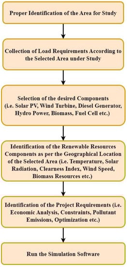 Designing any renewable-based integrated energy system (IES) in a software environment requires proper identification of the area in which the research is to be conducted. In order to optimize any IES in terms of technical and economical aspects under autonomous or on-grid mode, different types of parameter inputs are required, viz., requirements of loads, renewables available in that particular study area, components needed to setup an IES and market cost of those components []. Finally, the result requirements, viz., economic analysis, constraints, pollutant emission, etc., are to be specified before running the software. A detailed methodology related to the designing of any IES is shown as a flowchart in Figure 1.