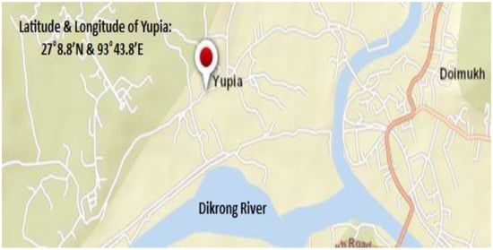 A recent report indicates that among all the un-electrified remote areas of India, the northeastern states, especially the state of Arunachal Pradesh, top the list []. Due to the difficult hilly terrain and various technical challenges, the small towns located in the state of Arunachal Pradesh very often face failure of the grid. Therefore, the current research aims to setup a renewable-based integrated energy system in the hilly town of Yupia (latitude: 27°8.8′ N and longitude: 99°43.8′ E) located very near to the Dikrong River. The proposed system will help to replace the traditional grid connectivity and can provide sustainable, reliable and continuous power to the hilly town. Yupia has a total population of 1261 with 253 households []. The proposed area has renewable potential of (i) biomass, because of its dense forest-cum-hilly location, (ii) hydro, because of its location near the Dikrong River, and (iii) solar, for setting up an autonomous IES. The map of Yupia is shown in Figure 2.